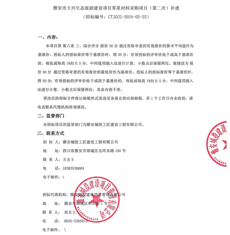 雅安市大興生態(tài)旅游建設(shè)項目零星材料采購項目(第二次)補遺公告