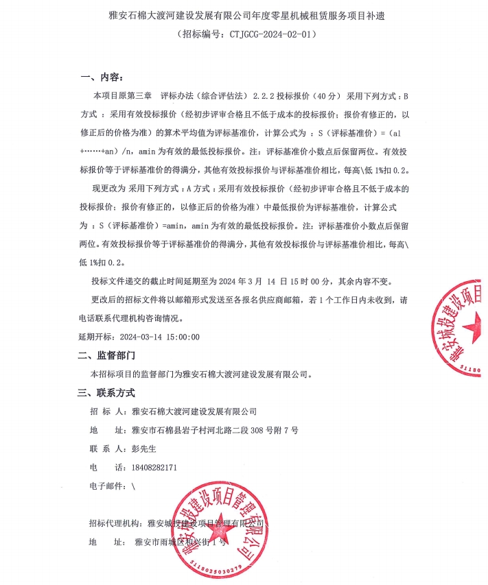 雅安石棉大渡河建設(shè)發(fā)展有限公司年度零星機(jī)械租賃服務(wù)項目補(bǔ)遺公告