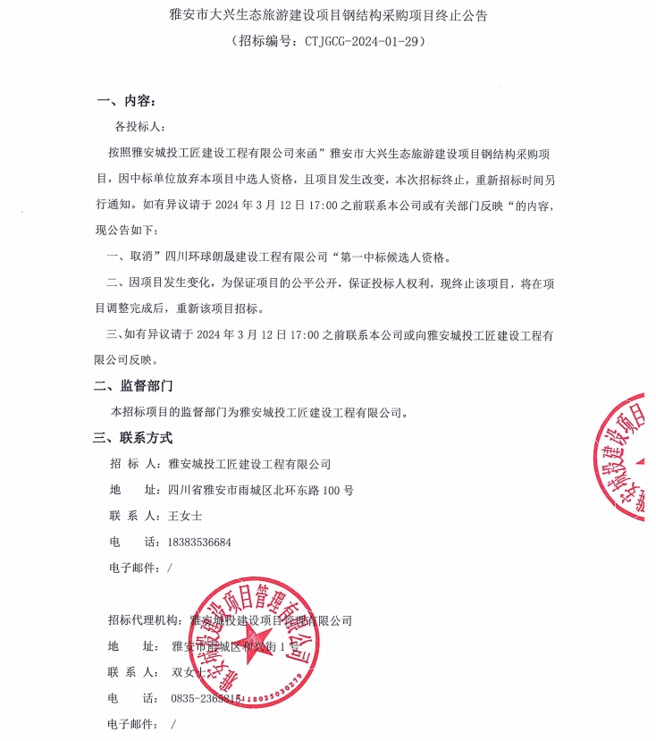 雅安市大興生態(tài)旅游建設(shè)項目鋼結(jié)構(gòu)采購項目終止公告