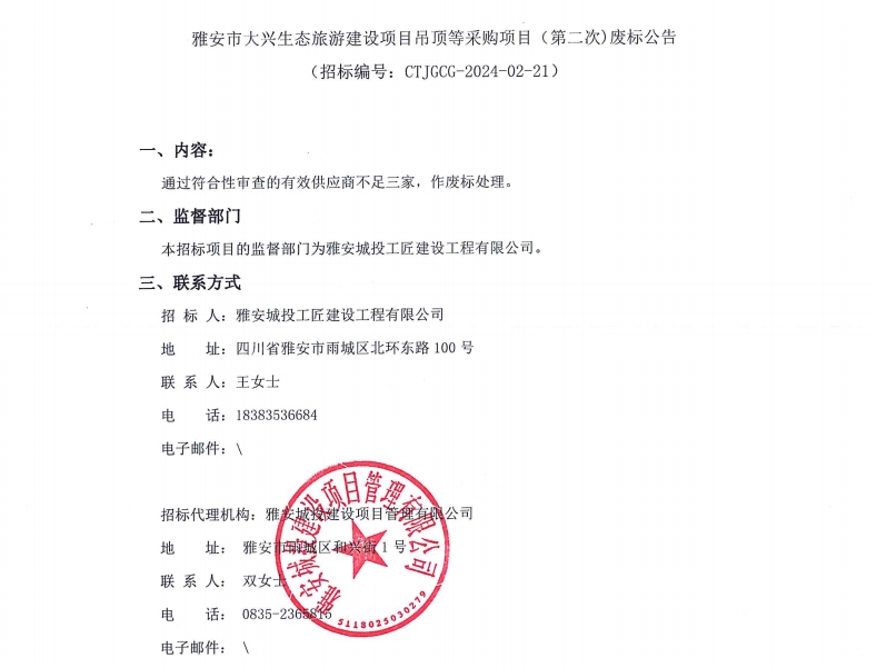 雅安市大興生態(tài)旅游建設(shè)項目吊頂?shù)炔少忢椖浚ǖ诙危⿵U標公告