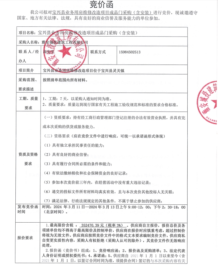 寶興縣業(yè)務(wù)用房維修改造項(xiàng)目成品門采購(含安裝)競價(jià)公告