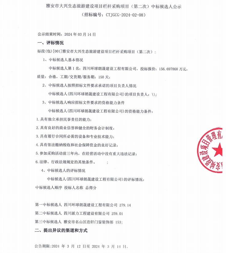 雅安市大興生態(tài)旅游建設(shè)項目欄桿采購項目(第二次)中標候選人公示