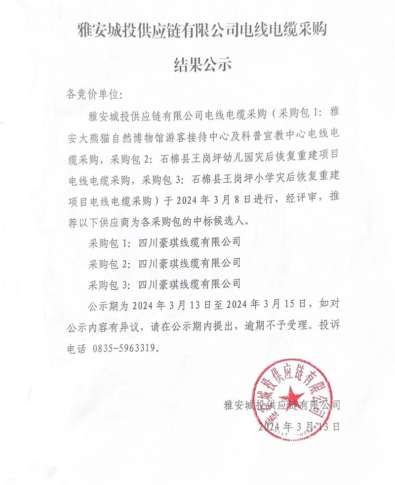 雅安城投供應鏈有限公司電線電纜采購結(jié)果公示