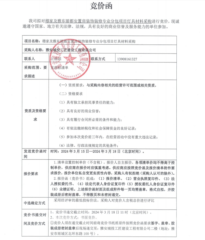 穆家及雅東麗都安置房裝飾裝修專業(yè)分包項(xiàng)目燈具材料采購競價(jià)公告