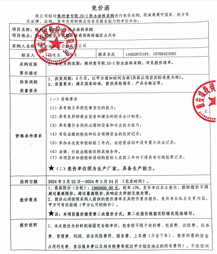 響應(yīng)文件格式-雅州壹號院JS-I防水涂料采購