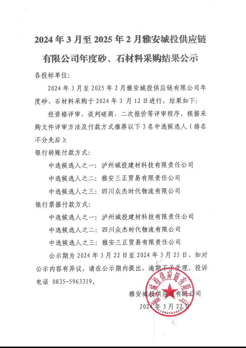 2024年3月至2025年2月雅安城投供應(yīng)鏈有限公司年度砂、石材料采購(gòu)結(jié)果公示