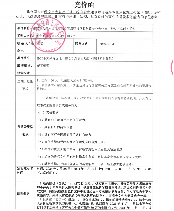 雅安市大興片區(qū)地下綜合管廊建設(shè)項(xiàng)目道路專(zhuān)業(yè)分包施工桁架(臨時(shí))采購(gòu)競(jìng)價(jià)公告