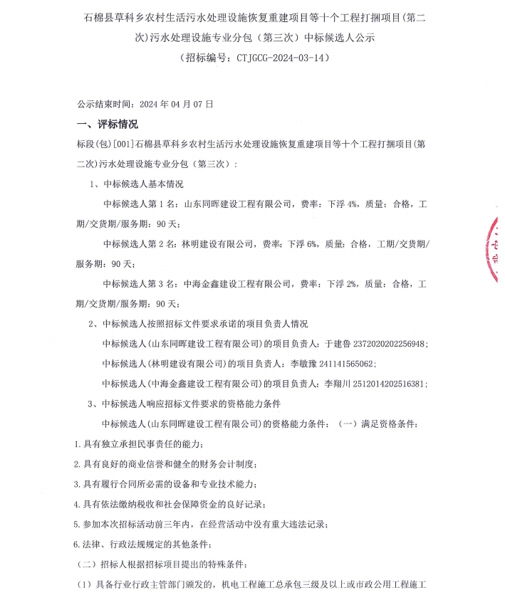 石棉縣草科鄉(xiāng)農(nóng)村生活污水處理設(shè)施恢復(fù)重建項目等十個工程打捆項目(第二次)污水處理設(shè)施專業(yè)分包(第三次)中標候選人公示