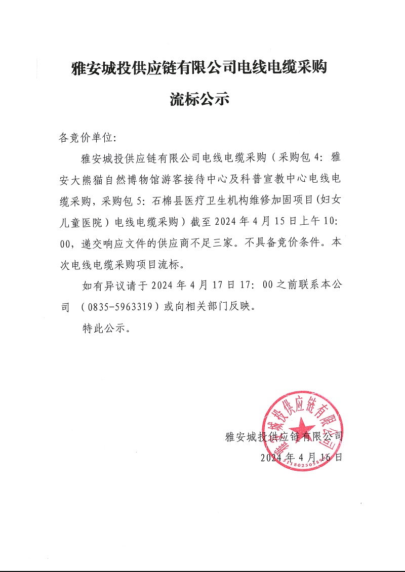雅安城投供應鏈有限公司電線電纜采購流標公示