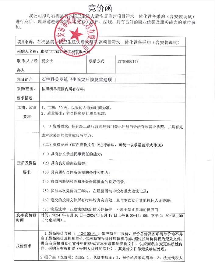 石棉縣美羅鎮(zhèn)衛(wèi)生院災后恢復重建項目污水一體化設備材料采購(含安裝調試)競價公告