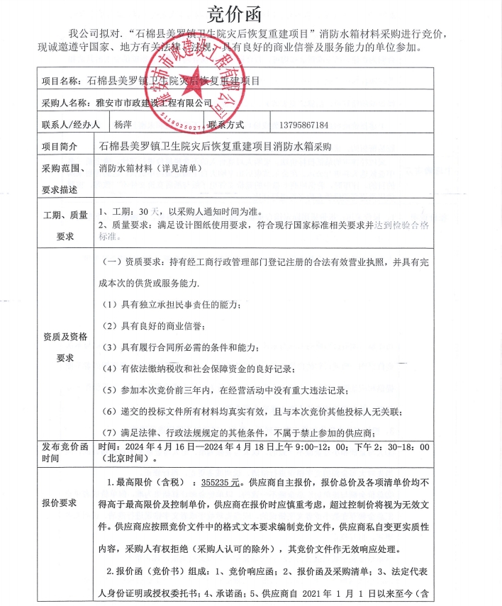 石棉縣美羅鎮(zhèn)衛(wèi)生院災(zāi)后恢復(fù)重建項(xiàng)目消防水箱材料采購競價(jià)公告