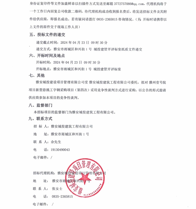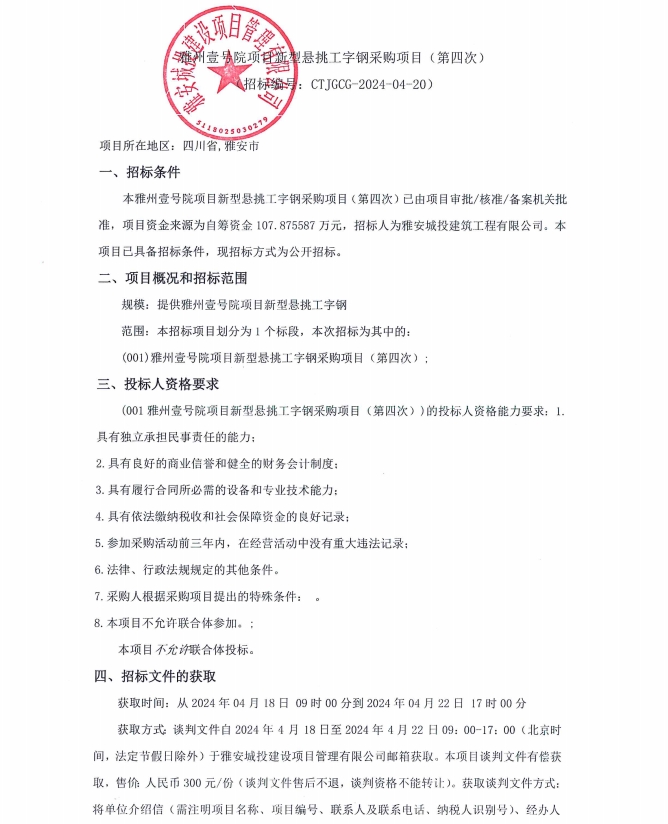 雅州壹號(hào)院項(xiàng)目新型懸挑工字鋼采購項(xiàng)目(第四次)公告