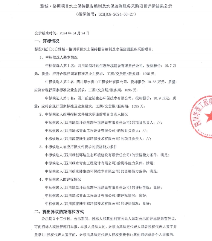 雅城·格調(diào)項目水土保持報告編制及水保監(jiān)測服務采購項目評標結(jié)果公示
