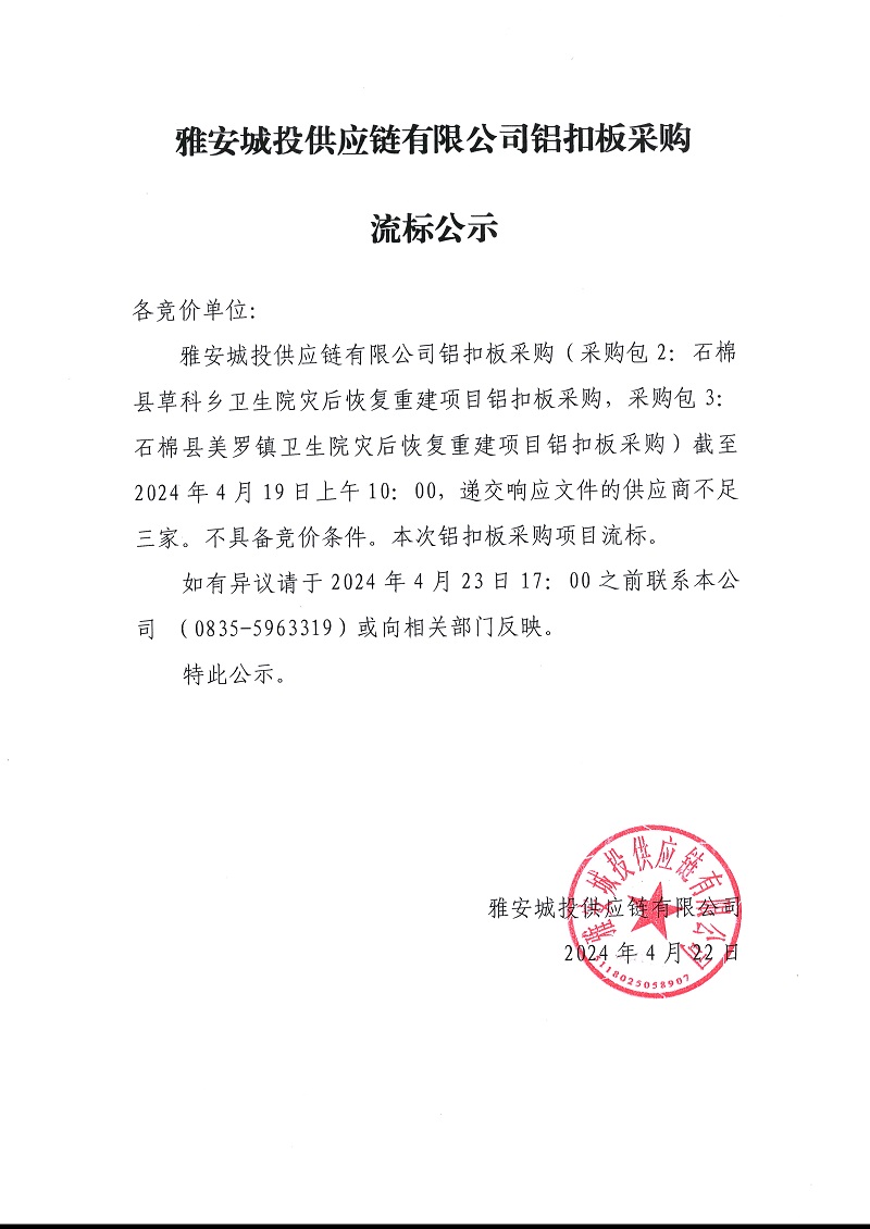 雅安城投供應(yīng)鏈有限公司鋁扣板采購流標(biāo)公示