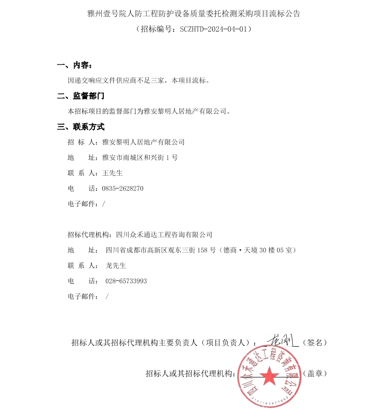 雅州壹號院人防工程防護設備質量委托檢測采購項目流標公告