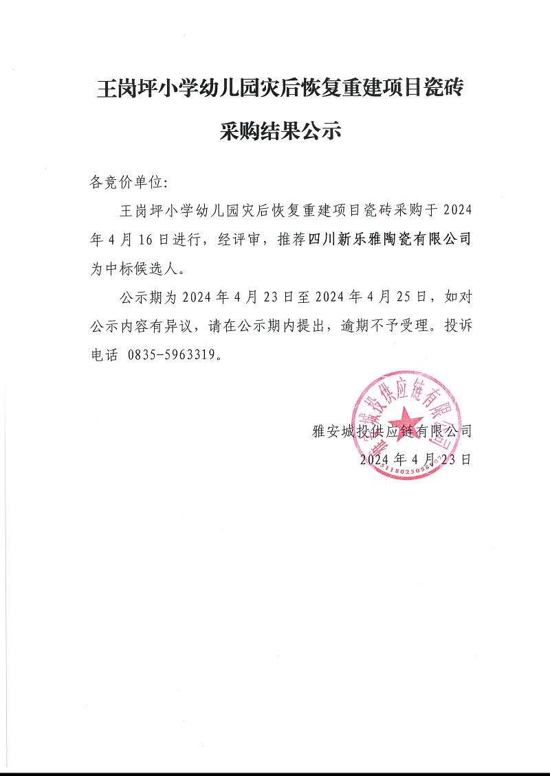 王崗坪小學(xué)幼兒園災(zāi)后恢復(fù)重建項目瓷磚采購結(jié)果公示