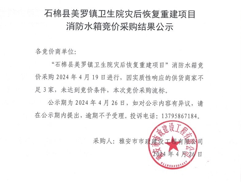 石棉縣美羅鎮(zhèn)衛(wèi)生院災(zāi)后恢復(fù)重建項(xiàng)目消防水箱材料競(jìng)價(jià)采購(gòu)結(jié)果公示