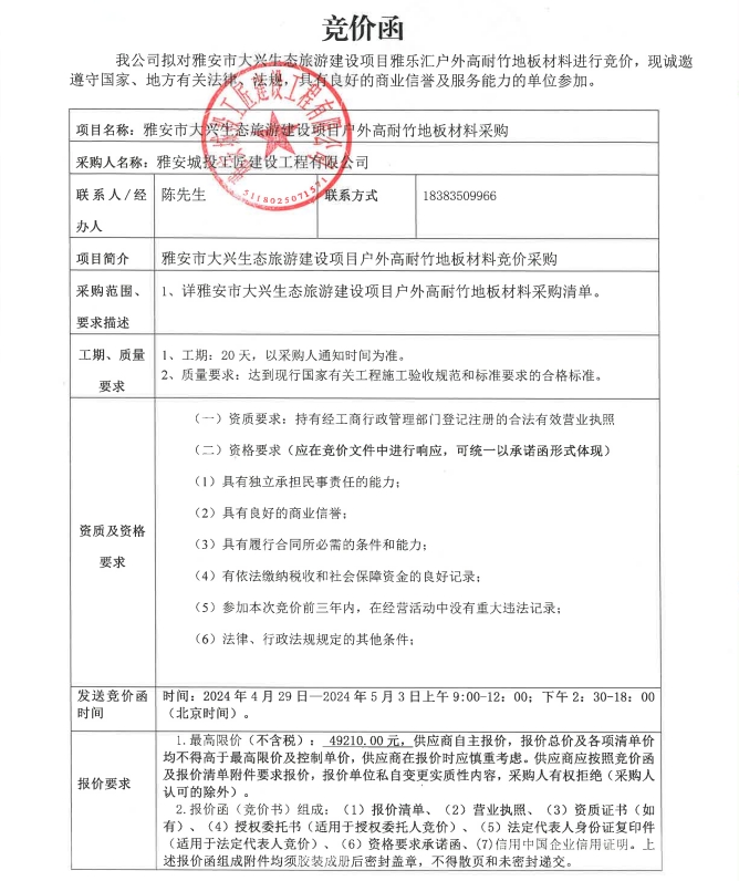 雅安市大興生態(tài)旅游建設(shè)項目霽雨橋、木棧道戶外高耐竹地板材料采購競價公告