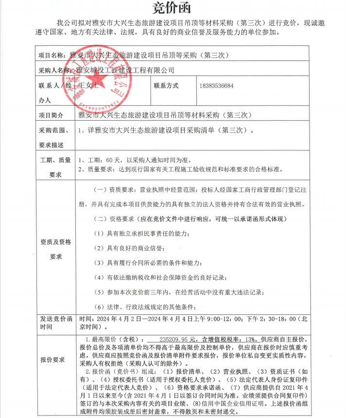 雅安市大興生態(tài)旅游建設項目吊頂?shù)炔牧喜少彛ǖ谌危└們r公告