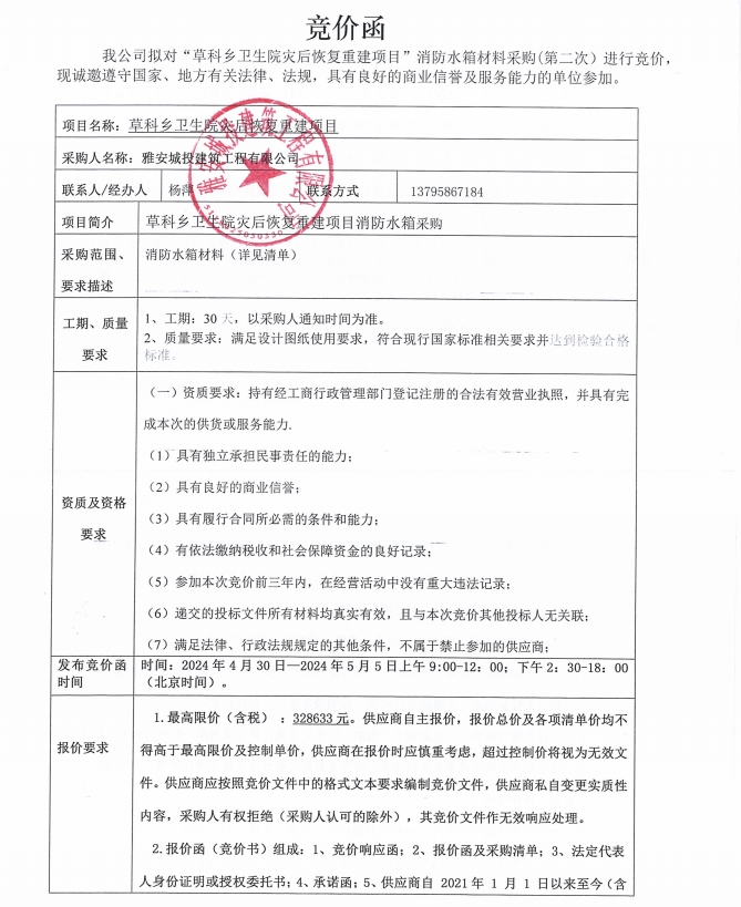 草科鄉(xiāng)衛(wèi)生院災(zāi)后恢復(fù)重建項(xiàng)目消防水箱采購(第二次)競價(jià)公告