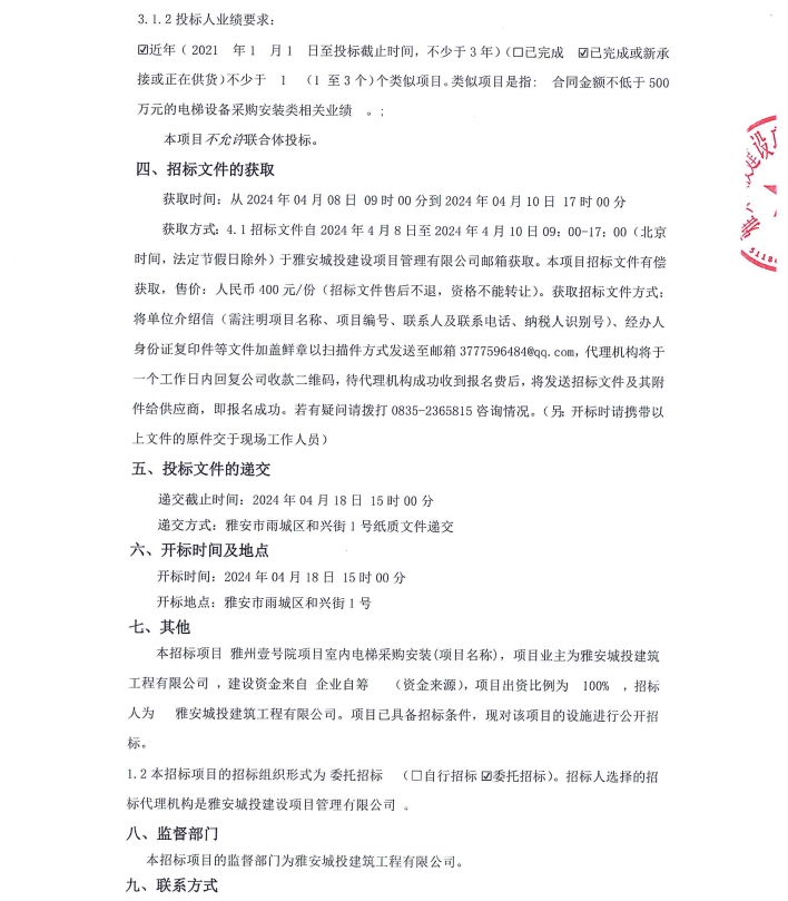 雅州壹號院項目室內(nèi)電梯采購安裝(項目名稱)設(shè)備采購/標(biāo)段公告