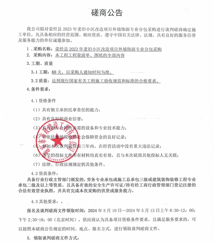 滎經(jīng)縣2023年老舊小區(qū)改造項(xiàng)目外墻飾面專業(yè)分包采購(gòu)磋商公告
