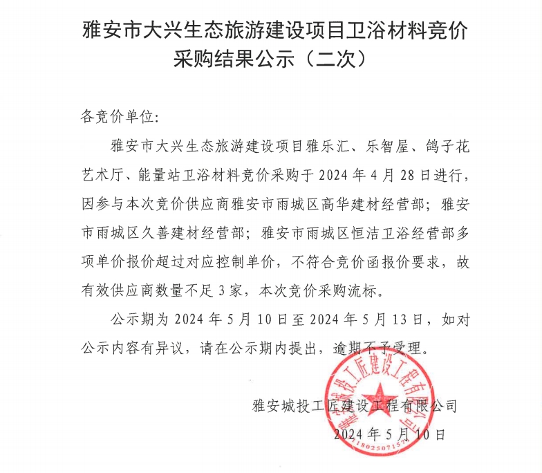 雅安市大興生態(tài)旅游建設(shè)項(xiàng)目衛(wèi)浴材料競(jìng)價(jià)采購結(jié)果公示(二次)