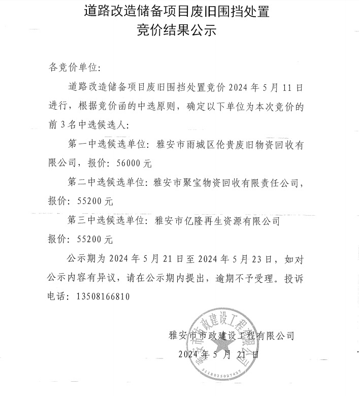 道路改造儲(chǔ)備項(xiàng)目廢舊圍擋處置競價(jià)結(jié)果公示