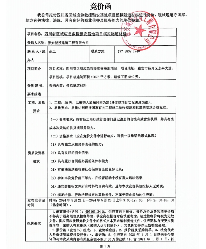 四川省區(qū)域應(yīng)急救援雅安基地項目模擬隧道材料競價公告