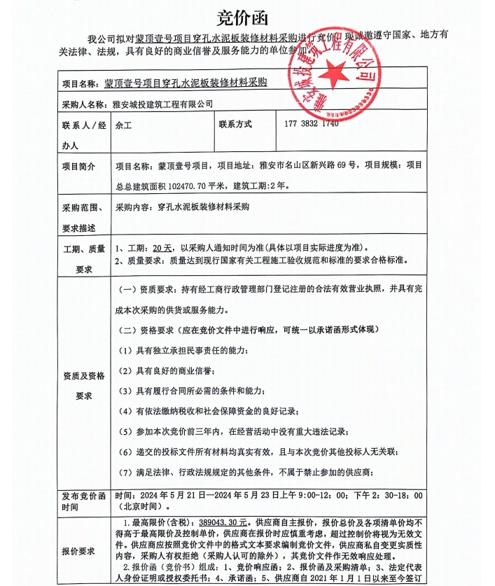 蒙頂壹號(hào)項(xiàng)目穿孔水泥板裝修材料采購競價(jià)公告