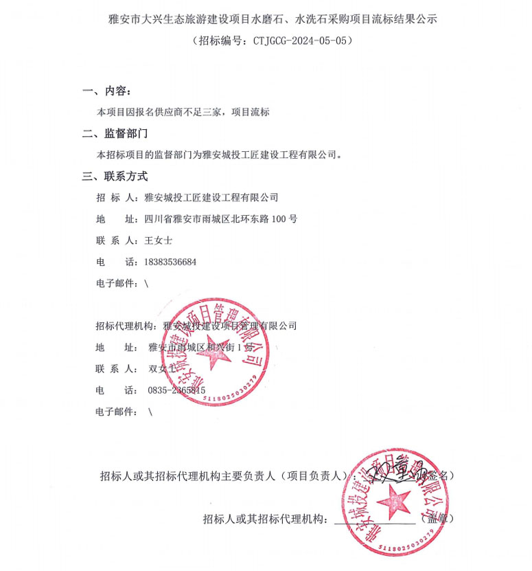 雅安市大興生態(tài)旅游建設(shè)項目水磨石、水洗石采購項目流標結(jié)果公示