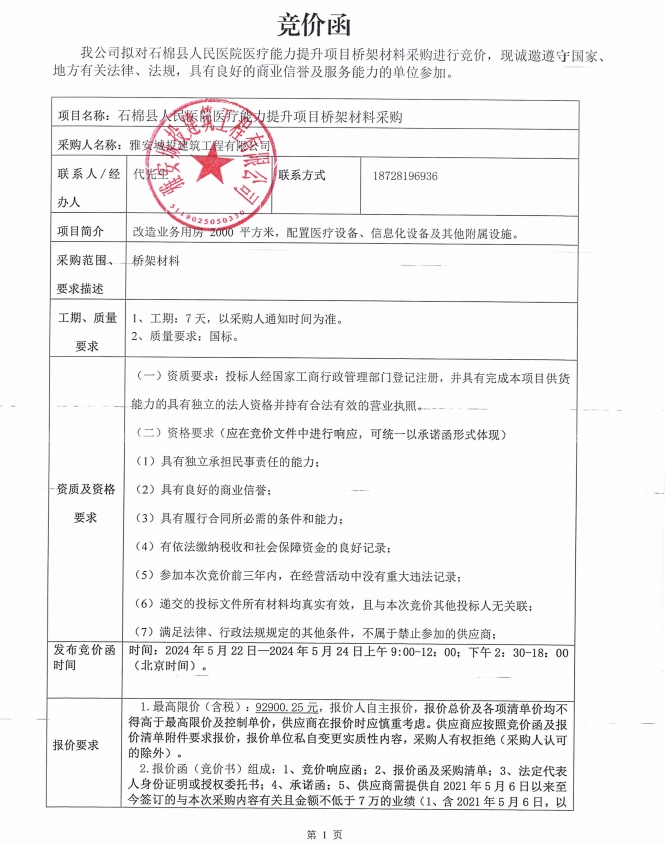 石棉縣人民醫(yī)院醫(yī)療能力提升橋架材料采購競價公告