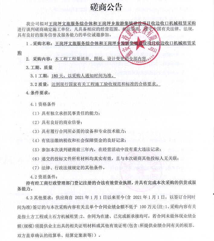 王崗坪文旅服務綜合體和王崗坪鄉(xiāng)旅游集鎮(zhèn)建設項目收邊收口機械租賃采購談判磋商公告
