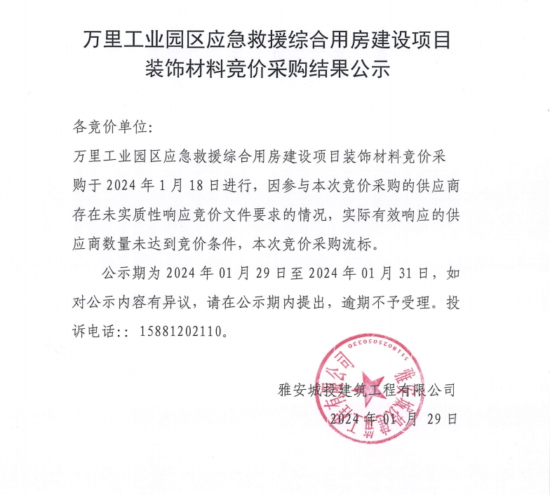 萬里工業(yè)園區(qū)應(yīng)急救援綜合用房建設(shè)項(xiàng)目裝飾材料競價采購結(jié)果公示