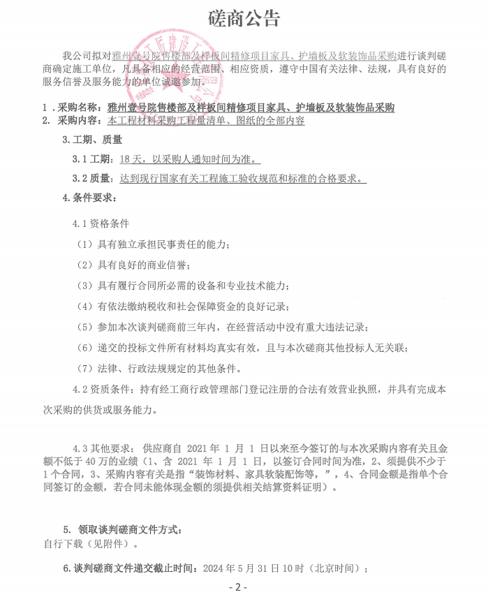 雅州壹號院售樓部及樣板間精修項(xiàng)目家具、護(hù)墻板及軟裝飾品采購磋商公告