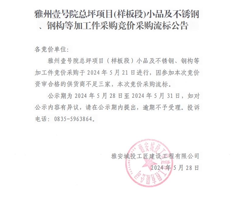 雅州壹號院總坪項目(樣板段)小品及不銹鋼、鋼構(gòu)等加工件采購競價采購流標(biāo)公告