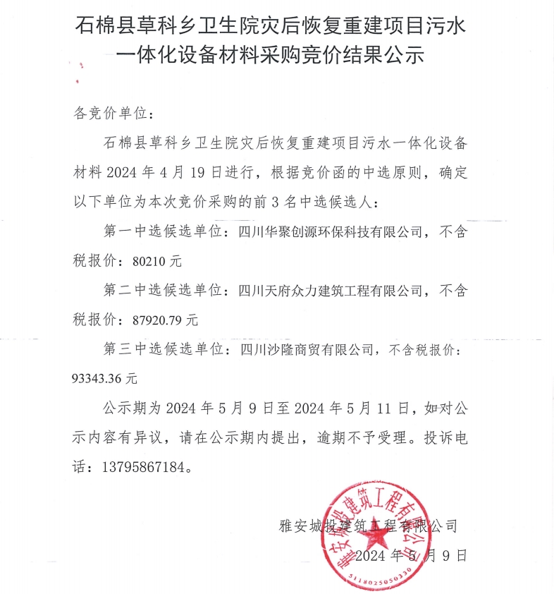 石棉縣草科鄉(xiāng)衛(wèi)生院災(zāi)后恢復(fù)重建項(xiàng)目污水一體化設(shè)備材料采購(gòu)競(jìng)價(jià)結(jié)果公示