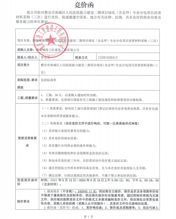 雅安市雨城區(qū)人民醫(yī)院能力建設(shè)二期項(xiàng)目綠化(含總坪)專業(yè)分包項(xiàng)目瀝青材料采購(三次)競價(jià)公告