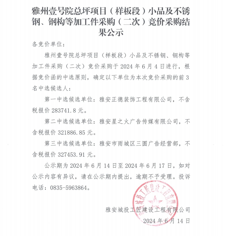 雅州壹號(hào)院總坪項(xiàng)目(樣板段)小品及不銹鋼、鋼構(gòu)等加工件采購(gòu)(二次)競(jìng)價(jià)采購(gòu)結(jié)果公示