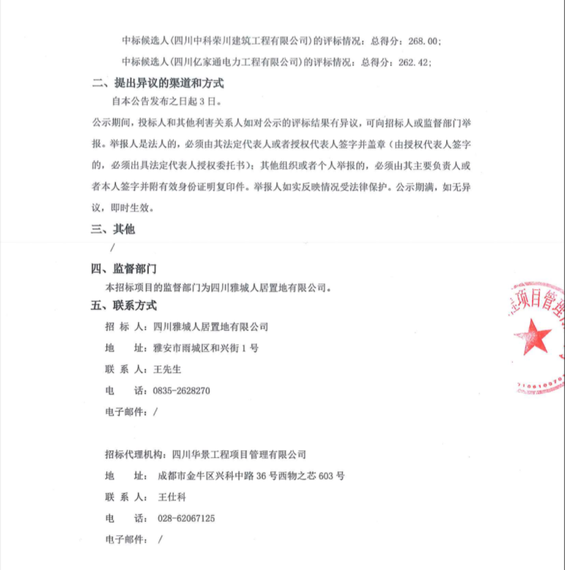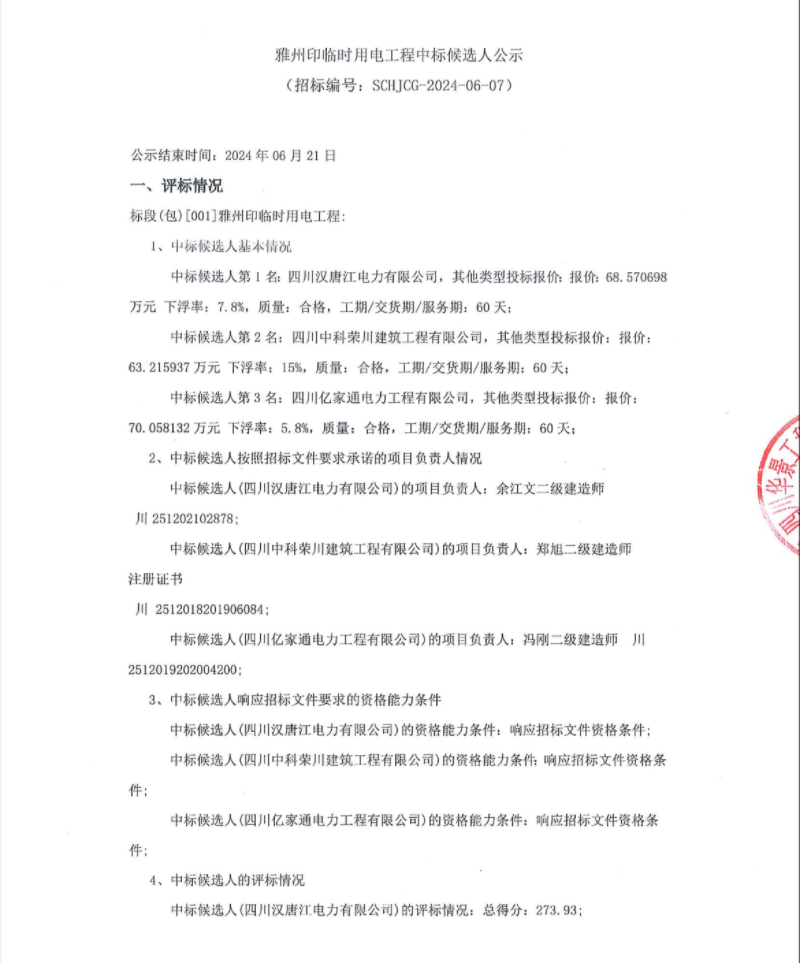 雅州印臨時用電工程中標候選人公示