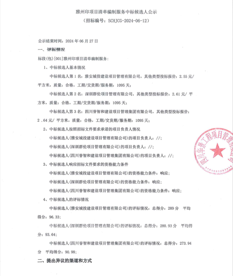 雅州印項(xiàng)目清單編制服務(wù)中標(biāo)候選人公示