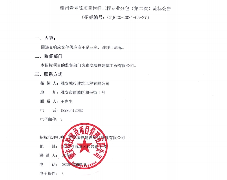 雅州壹號院項目欄桿工程專業(yè)分包(第二次)流標(biāo)公告