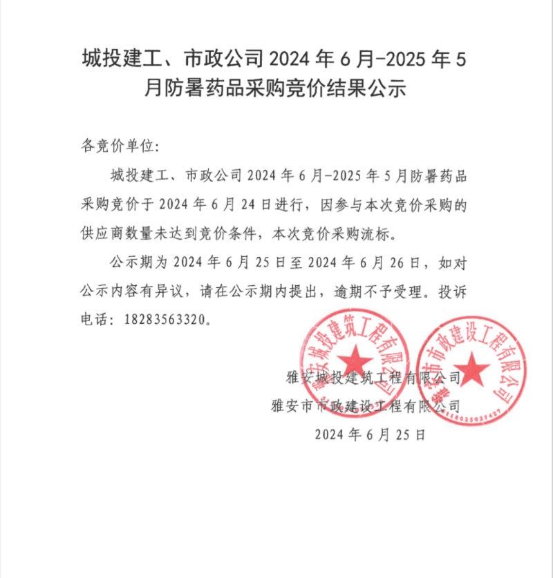 城投建工、市政公司2024年6月-2025年5月防暑藥品采購競價結(jié)果公示
