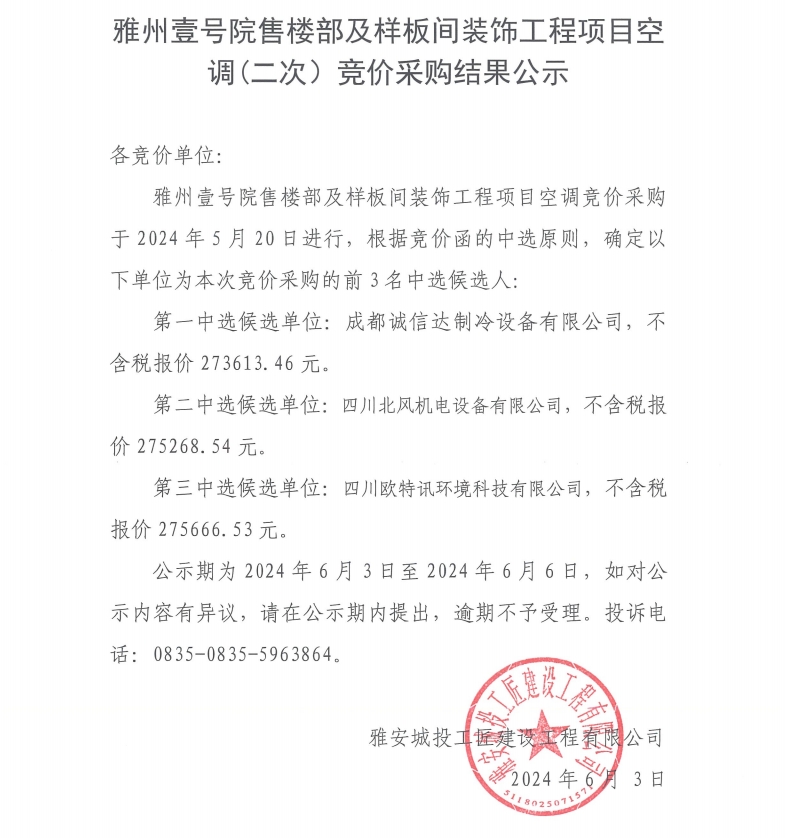 雅州壹號院售樓部及樣板間裝飾工程項目空調(二次)競價采購結果公示