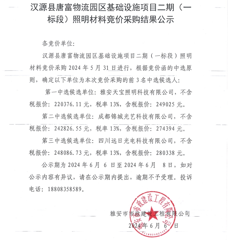 漢源縣唐富物流園區(qū)基礎(chǔ)設(shè)施項(xiàng)目二期(一標(biāo)段)照明材料競(jìng)價(jià)采購結(jié)果公示