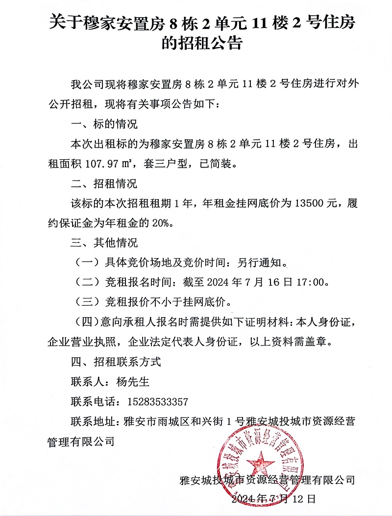 關(guān)于穆家安置房8棟2單元11樓2號(hào)住房的招租公告