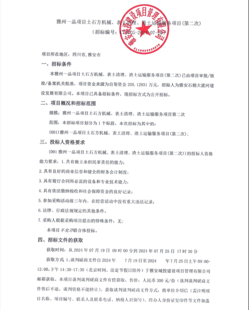 雅州一品項目土石方機械、表土清理、渣土運輸服務項目(第二次)公告