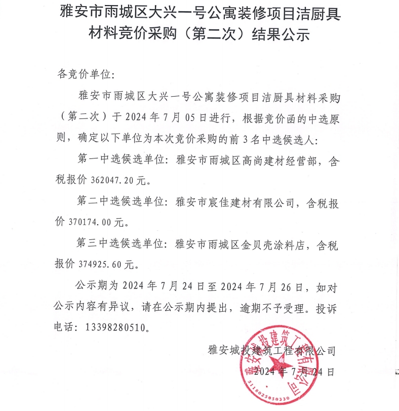 雅安市雨城區(qū)大興一號(hào)公寓裝修項(xiàng)目潔廚具材料競(jìng)價(jià)采購(gòu)(第二次)結(jié)果公示