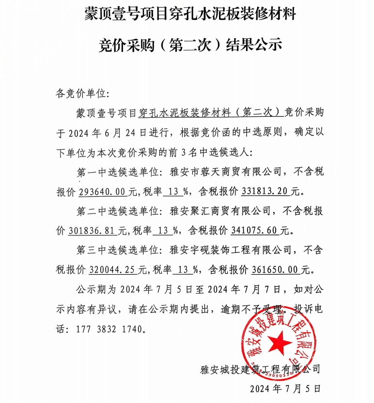 蒙頂壹號項目穿孔水泥板裝修材料競價采購(第二次)結(jié)果公示