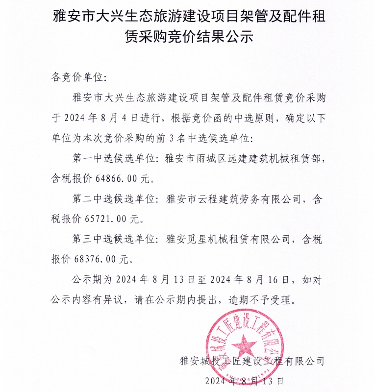 雅安市大興生態(tài)旅游建設(shè)項(xiàng)目架管及配件租賃采購(gòu)競(jìng)價(jià)結(jié)果公示